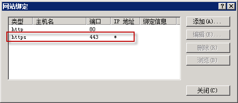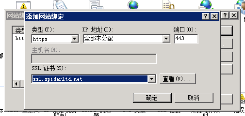 添加網站綁定內容:選擇類型為https,端口443和指定對應的SSL證書,點擊確定