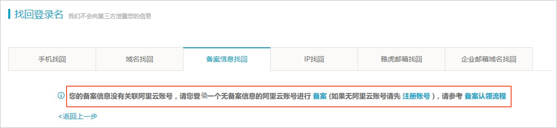 當(dāng)界面能正常跳轉(zhuǎn)至找回登錄名頁面時(shí),您可以根據(jù)界面提示,找回登錄名后直接登錄阿里云ICP代備案管理系統(tǒng)進(jìn)行備案信息管理。